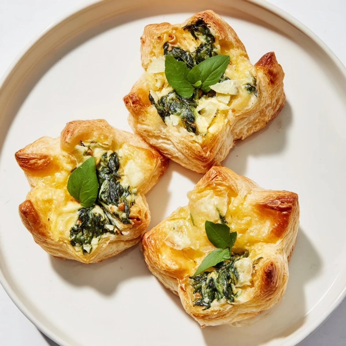 Merken Festliche, mundgerechte Snacks mit einer cremigen Spinat-Käse-Füllung, eingehüllt in goldenen Blätterteig, perfekt für die Feier des St. Patrick's Day.