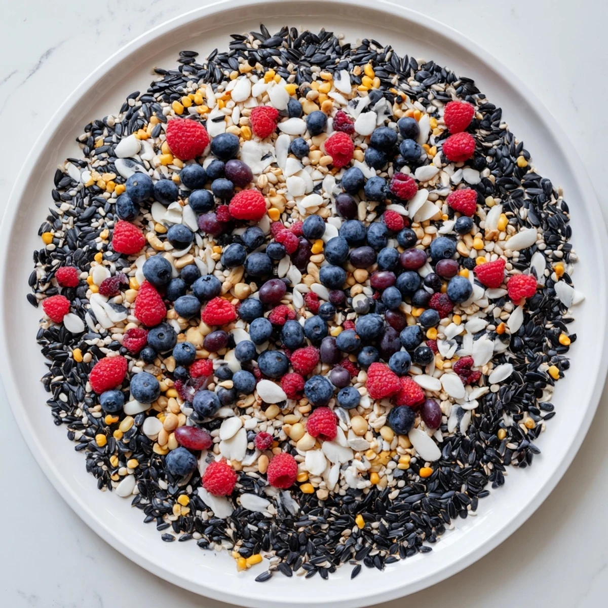 Merken Eine lebendige, nahrhafte Platte, die für Gartenvögel gestaltet wurde und eine bunte Auswahl an Samen, Nüssen und frischen Beeren bietet, um verschiedene gefiederte Freunde anzulocken.