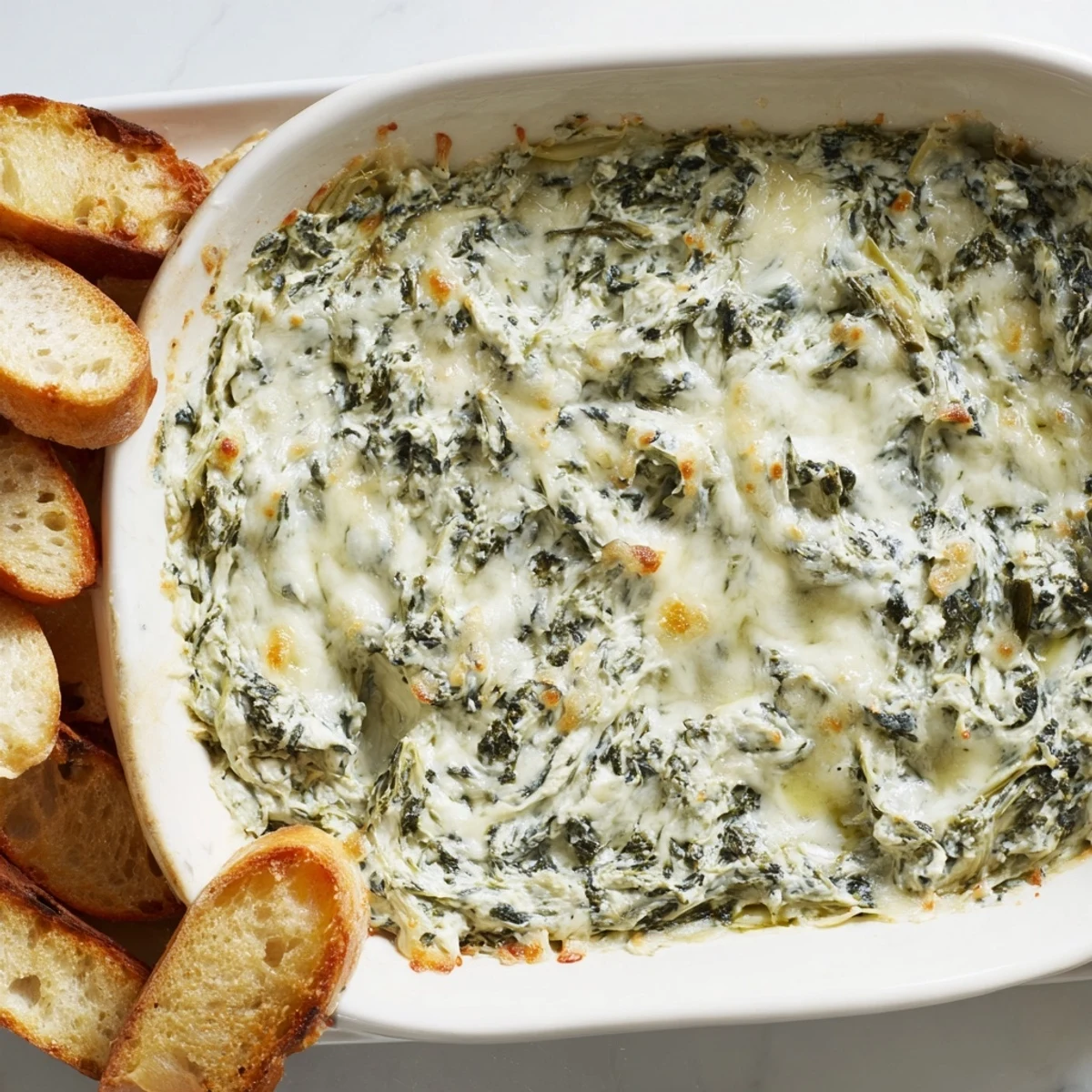 Merken Ein warmer, cremiger Dip mit Spinat, Artischockenherzen und einer Käsemischung, perfekt für Wintertreffen. Serviert mit gerösteten Baguettescheiben zum Dippen.