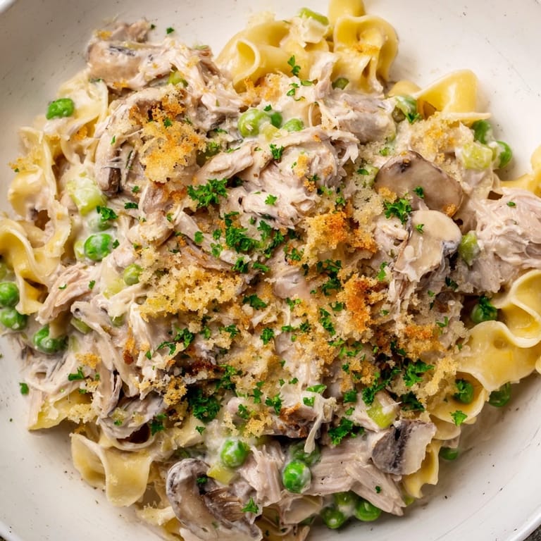 Dieser herzhafte Auflauf vereint zarte Eiernudeln mit Thunfisch und einer Auswahl an frischem Gemüse wie Erbsen, Champignons und Sellerie. Eingehüllt in eine samtige Sauce aus Milch, Sauerrahm und würzigen Senfnoten, wird das Gericht durch eine goldbraune Parmesan-Panko-Kruste veredelt. Einfach im Ofen gebacken, bietet diese Variante eine perfekte Mischung aus cremigen und knusprigen Texturen, ideal für gemütliche Mahlzeiten.