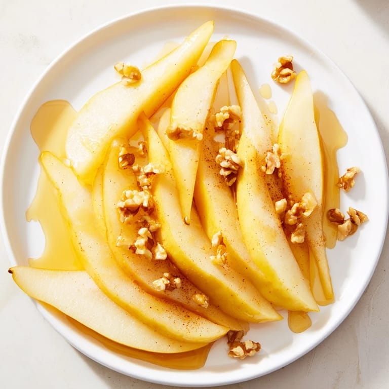 Merken Leichte und erfrischende Snacks mit reifen Birnenscheiben, veredelt mit einem zarten Honigüberzug. Perfekt für einen schnellen Snack oder elegante Vorspeise.