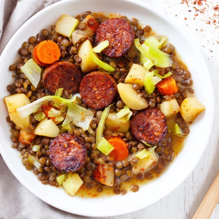Merken Ein herzhafter, geschmackvoller Eintopf, der klassische deutsche Linsen und Gemüse mit rauchiger Chorizo kombiniert, alles mühelos im Instant Pot für eine wohltuende Ein-Topf-Mahlzeit zubereitet.