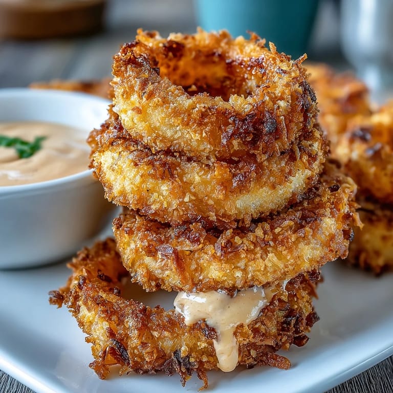 Merken My kitchen got quieter after my college roommate moved away, so I started making things that reminded me of our late-night snack sessions. These baked onion rings came together on a random Tuesday when I wanted that crispy, golden texture without heating up a vat of oil. The smoky paprika dip was actually an accident, born from having half-empty jars in my fridge and refusing to waste them. Something clicked when I tasted that first ring dunked in the cream, and I realized I'd stumbled onto something better than the fried version I'd been chasing.