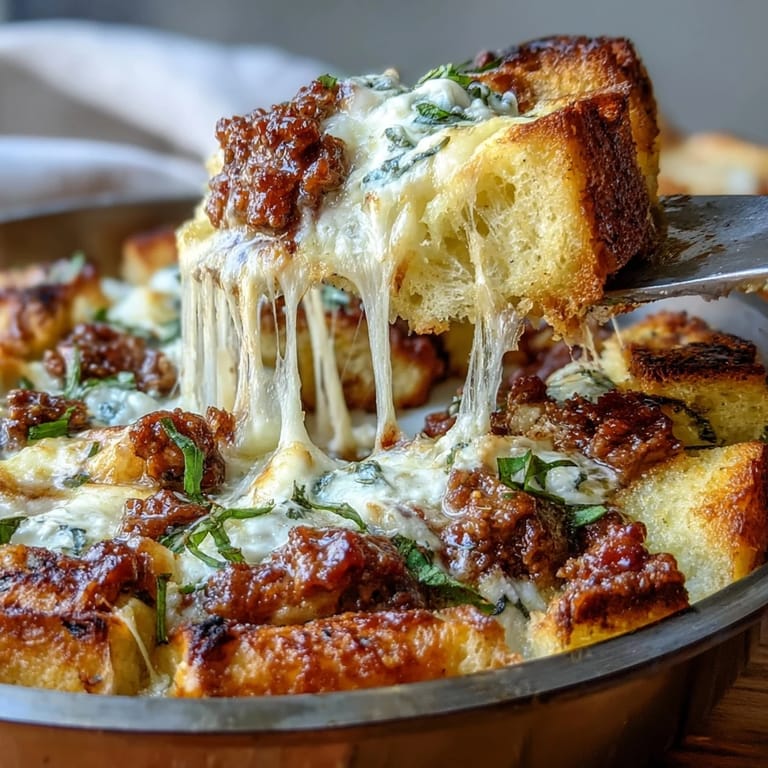 Merken My cast-iron skillet sits on the stovetop year-round, but nothing quite compares to the moment I decided to throw everything I love about lasagna into it without fussing over noodles. That evening, while staring at a baguette and a jar of marinara, something clicked—why not layer the bread like pasta and let the oven do the heavy lifting? The result was so golden and bubbly that my kitchen smelled like an Italian grandmother's dream mixed with a garlic bread fever dream. Now it's become the dish I reach for when I want to feel like I've cooked something impressive without spending hours at the stove.