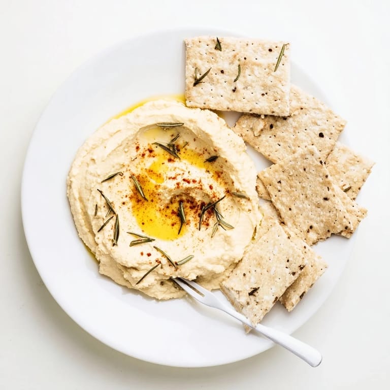 Merken Crisp, aromatic rosemary crackers paired with creamy hummus make a festive and crowd-pleasing appetizer, perfect for entertaining during the holidays.
