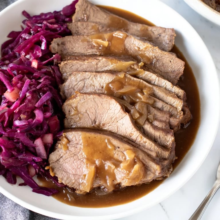 Merken Ein klassischer deutscher Sauerbraten mit Apfel-Rotkohl: zartes, mariniertes Rindfleisch, langsam geschmort und serviert mit würzig-süßem Rotkohl und Äpfeln. Dieses wärmende Gericht vereint kräftige Aromen, ist ideal für festliche Anlässe oder den Sonntags-Familientisch.