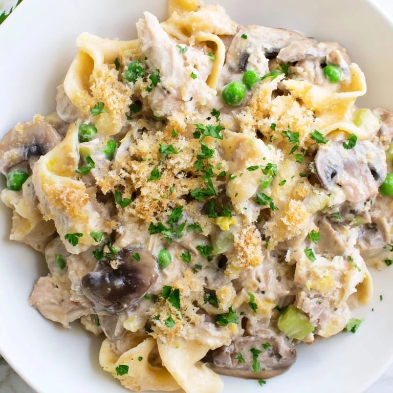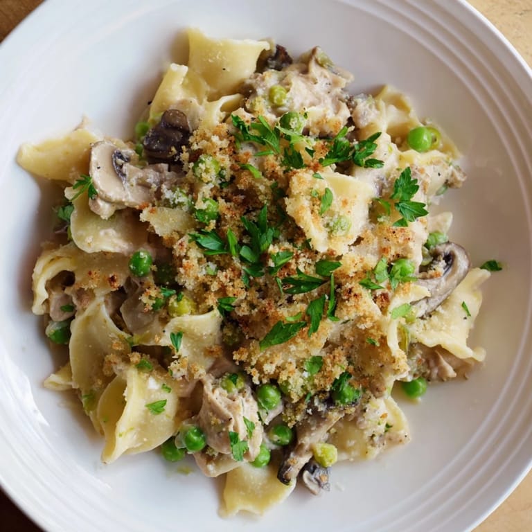 Merken Meine Großmutter machte diesen Auflauf immer mittwochs, wenn das Budget knapp war und trotzdem etwas Besonderes auf den Tisch musste. Jahre später erkannte ich, dass sie nicht nur Reste kombinierte – sie schuf Trost in einer Schüssel. Dieses aktualisierte Rezept ehrt diese Tradition, aber mit einer cremigen Sauce, frischem Gemüse und einer knusprigen Panko-Parmesan-Krönung, die den klassischen Komfortgenuss in etwas Zeitgemäßes verwandelt.